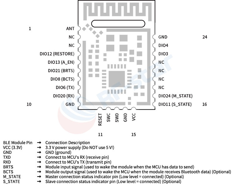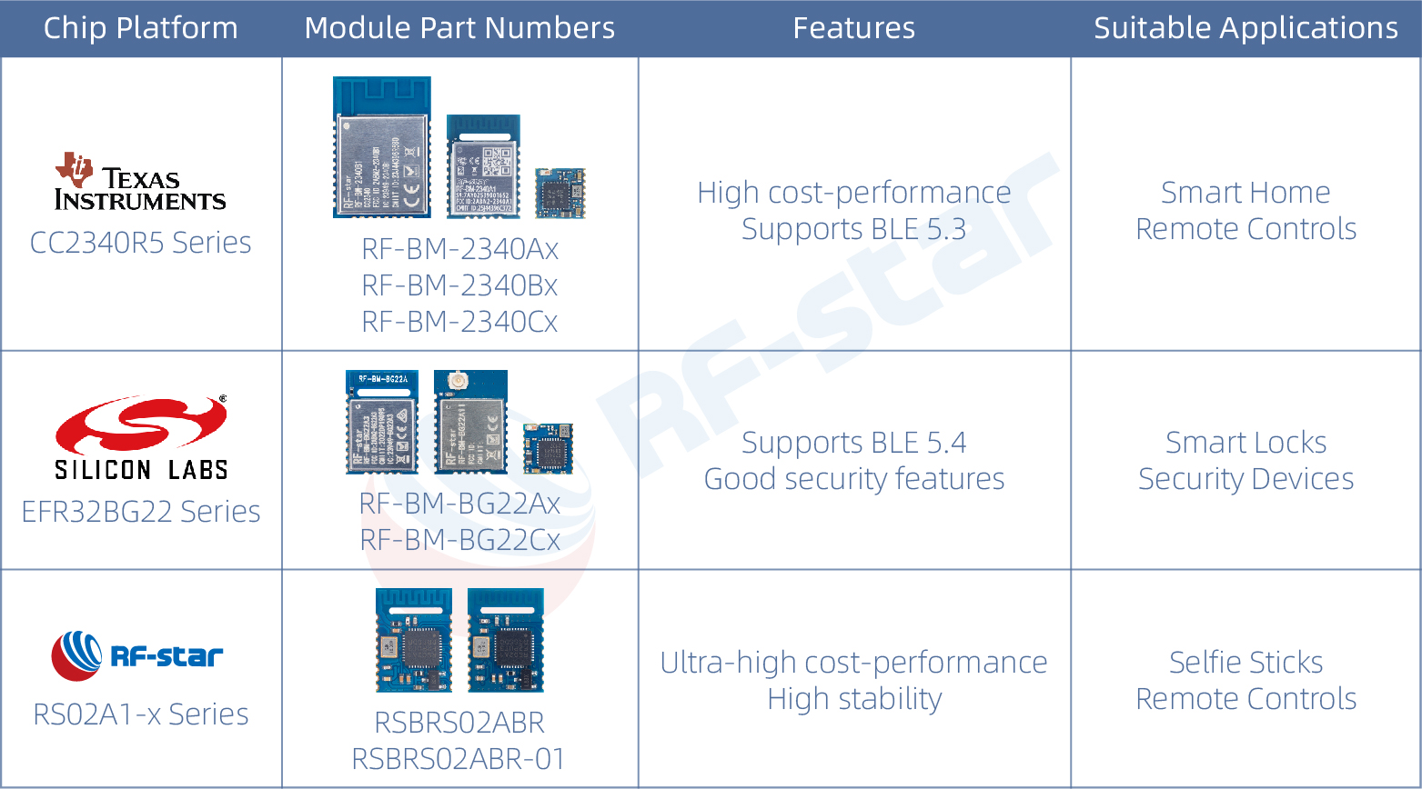 Модуль контроллера: Обладает собственными вычислительными мощностями и может быть запрограммирован для работы с логикой. Клиенты могут писать собственные программы для использования внутреннего ядра микросхемы, что потенциально позволяет избежать использования внешнего микроконтроллера и снизить затраты. Например, в RF-star RF-BM-2340B1 используется TI CC2340R5, имеющий встроенное ядро ARM Cortex-M0+, и все выводы GPIO выведены наружу, что позволяет обрабатывать как Bluetooth-связь, так и пользовательские приложения.