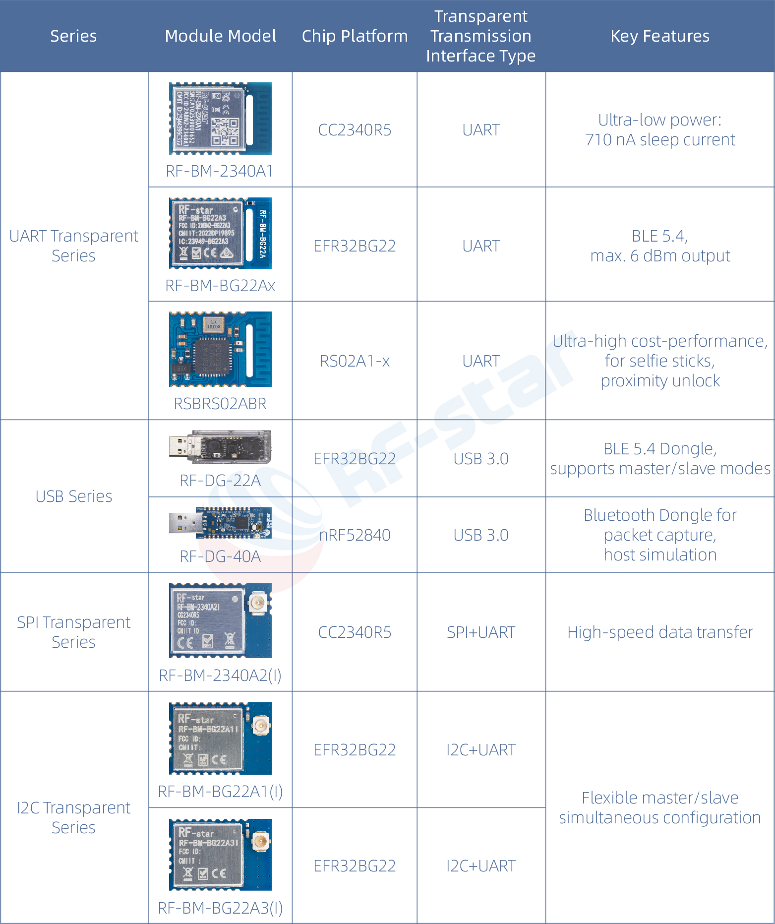 Модули RF-star классифицированы по чип-платформе.