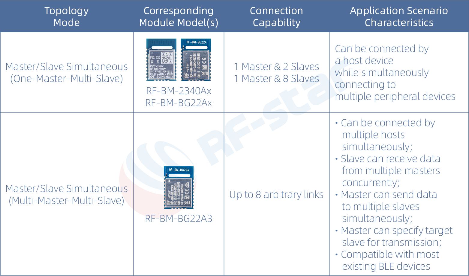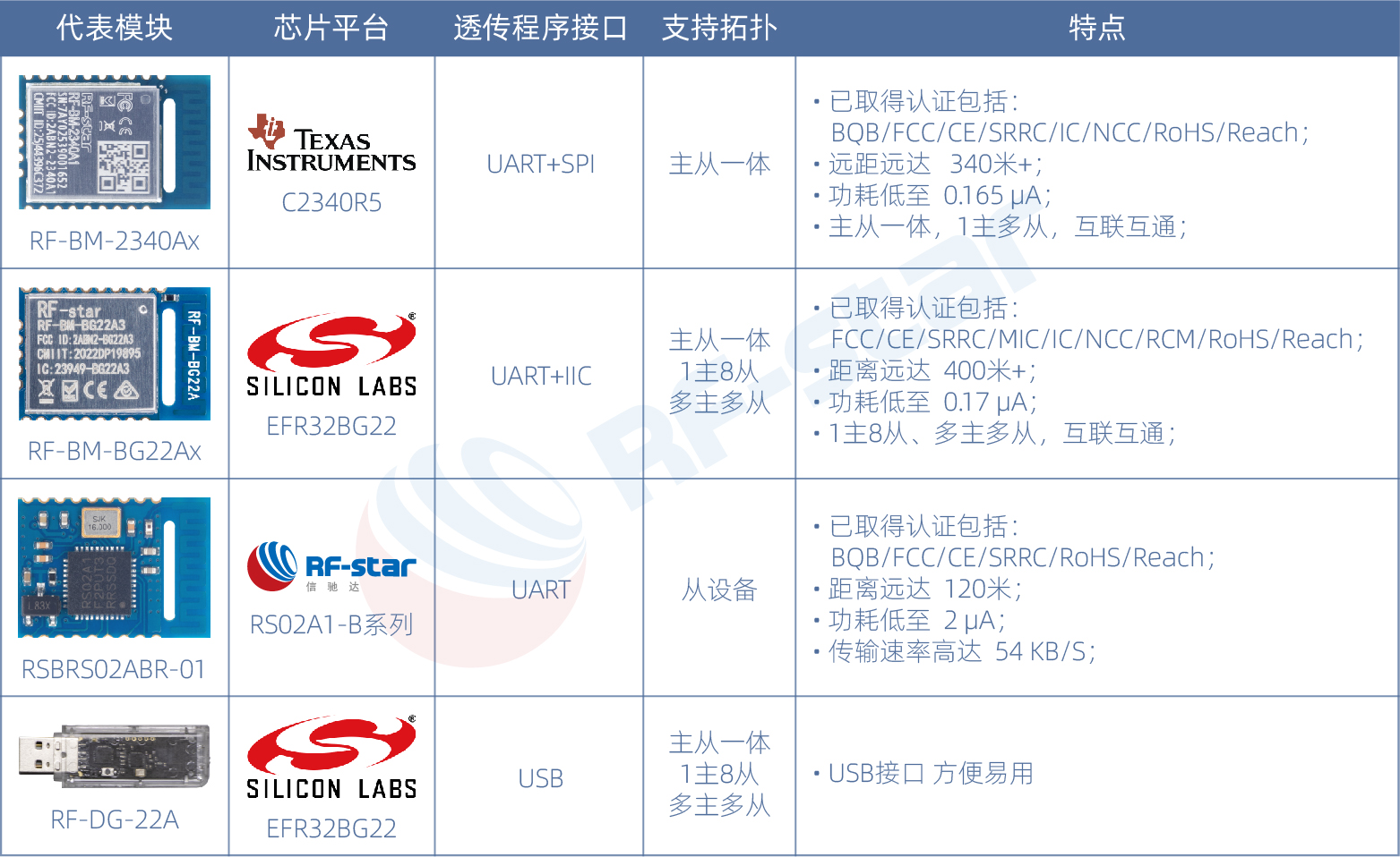 Тип SPI/I2C: Различия в скорости последовательной передачи данных, например, RF-BM-2340A2 поддерживает протокол прозрачной передачи SPI, а RF-BM-BG22Ax — протокол прозрачной передачи I2C.
