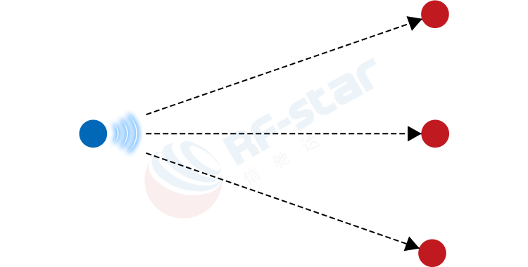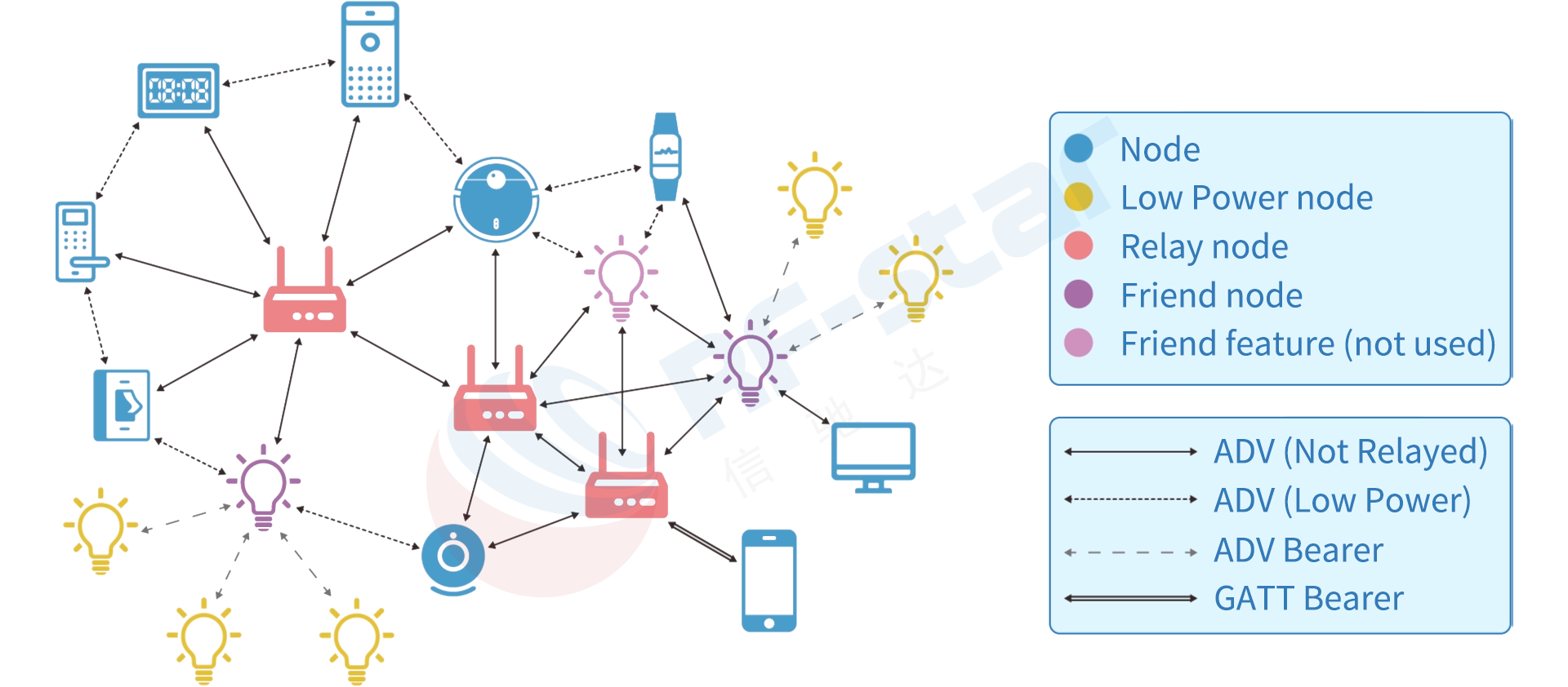 Bluetooth Mesh-сеть «один ко многим»: Использует подход управления сетью, основанный на «затоплении». Каждый узел, получивший сообщение, пересылает его через другие узлы, пока оно не будет получено целевым узлом. Теоретически сеть может включать десятки тысяч узлов, обеспечивая связь по схеме «многие ко многим». Однако сеть сложна, а энергопотребление и задержку трудно контролировать.