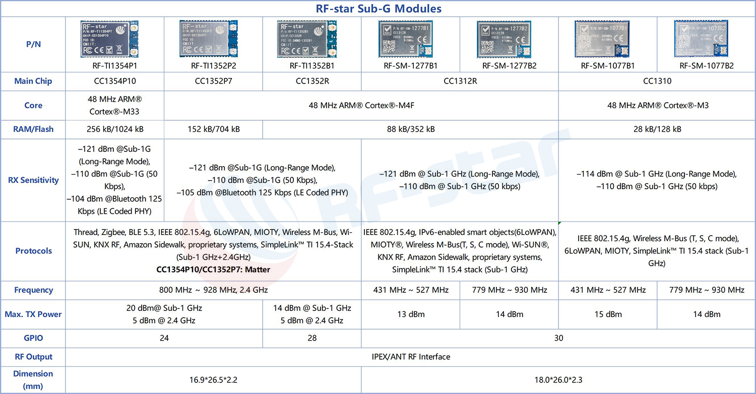 Некоторые модули RF-Star Sub-G поддерживают одновременную работу в двух режимах (2,4 ГГц + Sub-G), а также различные протоколы связи, такие как Wi-SUN и фирменные протоколы. Одна и та же аппаратная платформа может адаптироваться к различным требованиям рынка и приложений, оставляя достаточно места для будущих обновлений продукта и расширения функций.